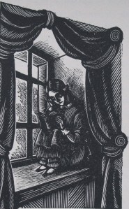 This is an image of little Jane Eyre from an issue of Charlotte Bronte’s novel published in 1943 by Random House. It is illustrated with captivating woodcuts by Fritz Eichenberg.