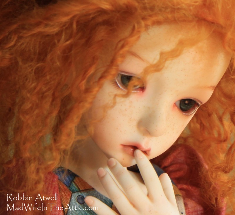 I’ve followed Robbin Atwell for some time, being particularly interested in how she, as a non-Japanese/Korean, interprets girlish beauty on BJD faceups. In the earier post about Mia Hays I mentioned in particular the large features on a small face: while “anime eyes” are obviously exaggerated, Mia’s features in terms of space between bottom lip and chin, space between eyes, distance from outside of the eye to ears, etc., are not so dissimilar from those of the “Deogi” doll whose face Robbin so expertly creates. Looking again, I was taken by the strength of the fulcrum, and how sensuous it seems to make the mouth, and also how cute she is with freckles and red hair!