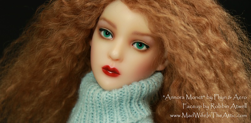 I got the opportunity to paint a 2nd Phyn & Aero “Annora Monet.” This one belongs to my friend Marcia, who owns Facets Boutique (for all your fashion doll needs). This Annora will be more of a high fashion style girl. Marcia asked for red lips, reddish brown eye brows, a natural look, and no pink around the eyes. What?? All my girls have pink around the eyes! What I see as artistic, others see as conjunctivitis. OK, no pink (well not a lot anyway).